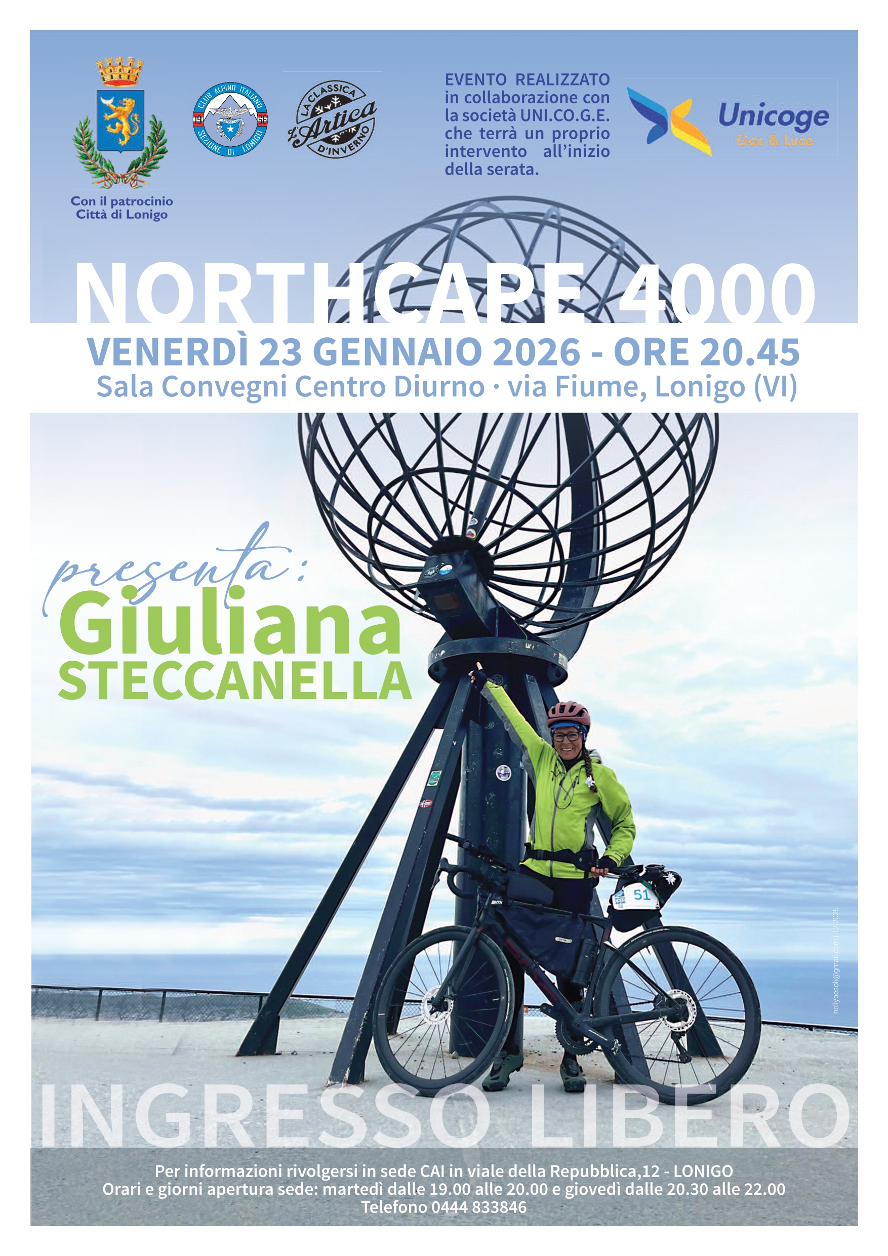 Attività culturali Venerdì 23 gennaio 2026, alle 20.45 Lonigo Sala Convegni Centro Diurno, in via Fiume Giuliana Steccanella ci racconterà il suo viaggio in bicicletta verso il Polo Nord ...