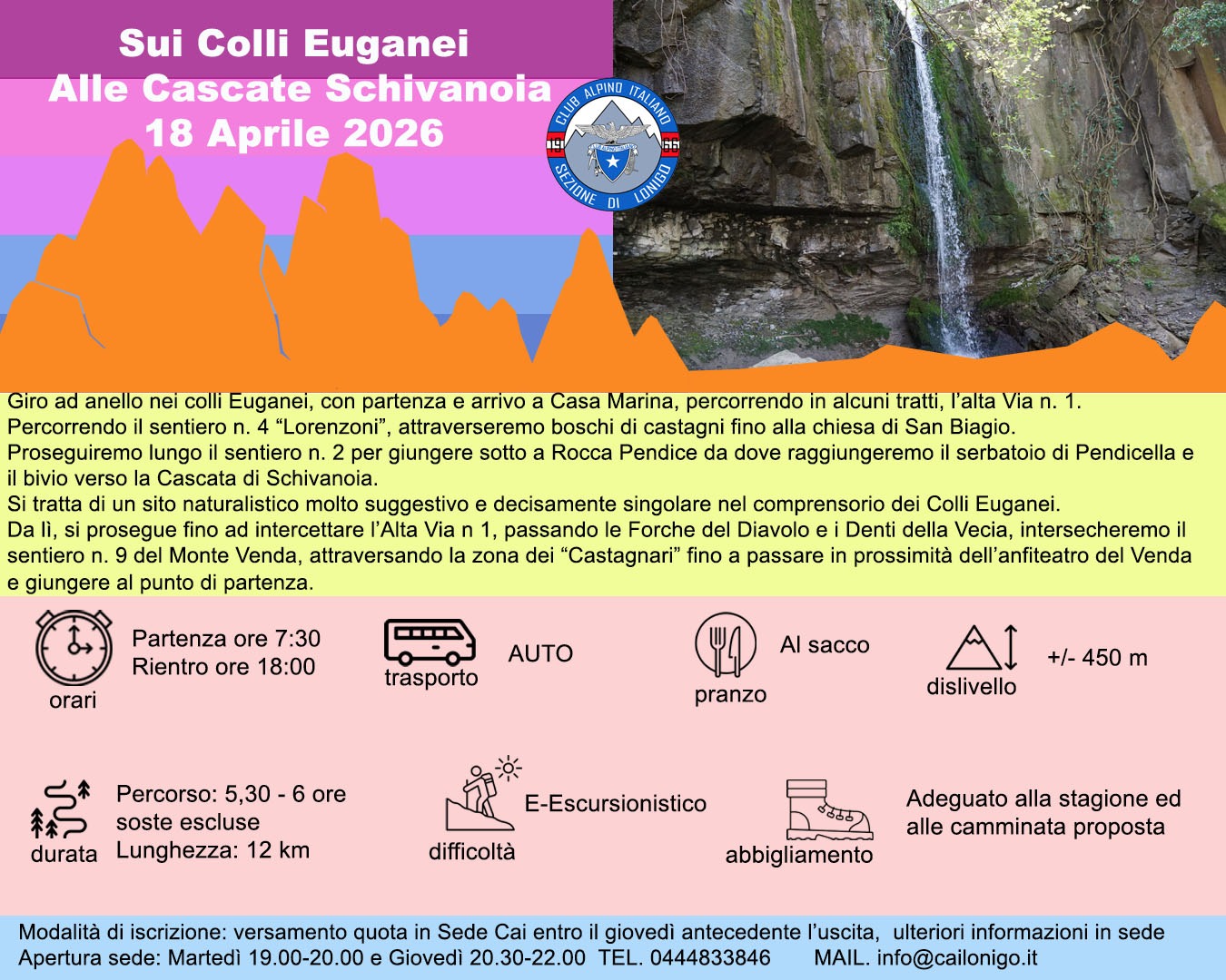 Escursionismo estivo Sabato 18 aprile 2026 Escursione sui Colli Euganei, alla cascata Schivanoia Prende il via la stagione 2026 di escursionismo estivo. L’escursione di apertura è...