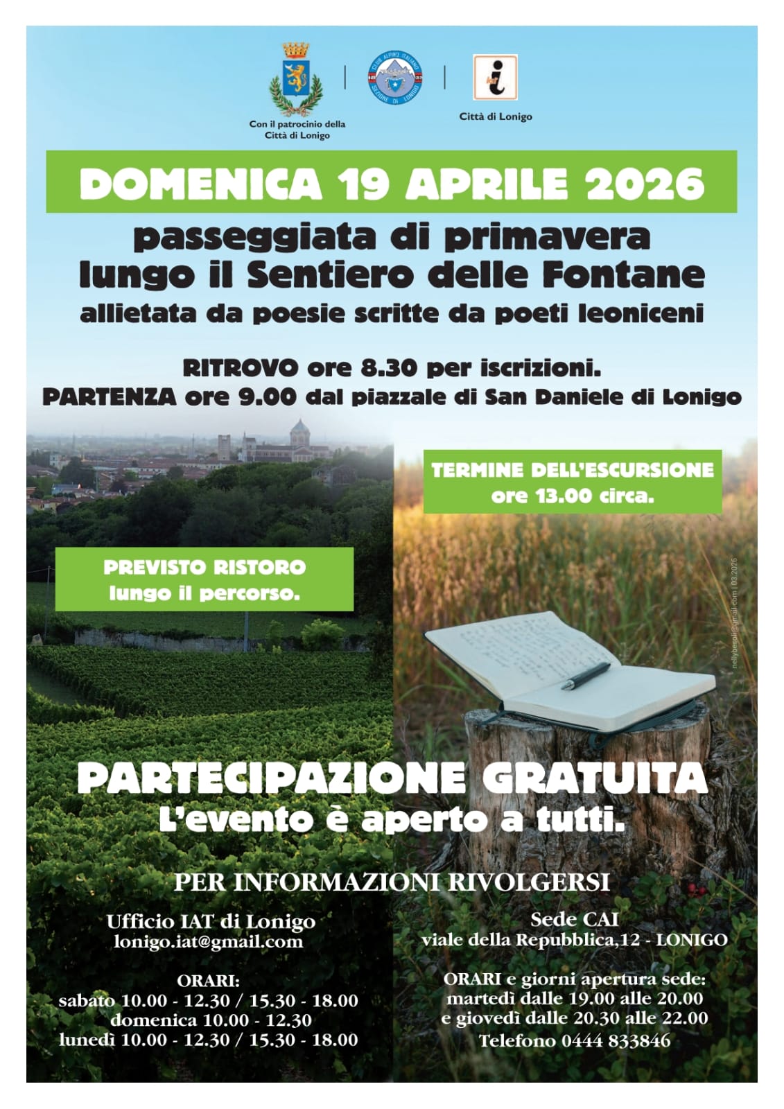 Domenica 19 aprile 2026 Passeggiata lungo il Sentiero delle Fontane di Lonigo Ti va una mattinata all’aria aperta tra natura e cultura? Ti aspettiamo a Lonigo per un evento speciale apert...